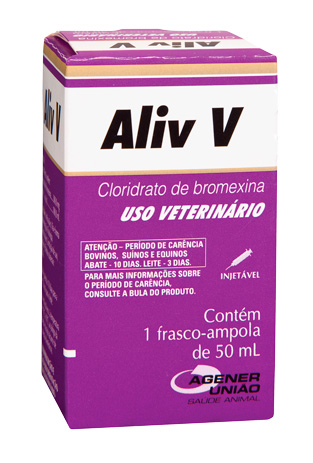 A bromexina é um expectorante mucolítico assim denominado porque produz diminuição da viscosidade das secreções pulmonares. A bromexina também altera a permeabilidade da barreira alvéolo-capilar, contribuindo para o aumento das concentrações de imunoglobulinas e certos antibióticos nas secreções pulmonares. Tais efeitos, aliados à ação broncodilatadora, favorecem a expectoração e a melhora dos quadros de tosse com origem pulmonar. Aliv V é indicado para o tratamento de quadros respiratórios em que há acúmulo de secreções e para o tratamento de metrites purulentas, podendo ser associado com antimicrobianos.