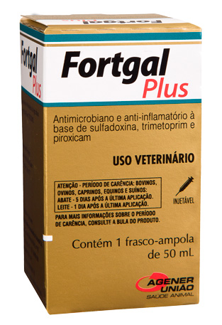 Fortgal Plus apresenta em sua formulação a associação entre 2 antimicrobianos (sulfadoxina e trimetoprim) e o anti-inflamatório não-esteroidal piroxicam, sendo indicado para bovinos, equinos, suínos, ovinos e caprinos. A sulfadoxina é a sulfonamida que apresenta a maior duração de ação em comparação às demais sulfas por suas propriedades lipofílicas. Sua ação é potencializada pelo trimetoprim, pois ambos fármacos interferem com a produção de ácido fólico, necessário para a síntese de proteínas e ácidos nucleicos. O piroxicam é um potente anti-inflamatório da classe dos ácidos propiônicos, com ação anti-inflamatória, analgésica e antitérmica que se estende por cerca de 50 horas. A redução da inflamação no local de infecção facilita a ação da sulfadoxina e do trimetoprim, reduz a dor e permite um retorno mais rápido dos animais à produção. Fortgal Plus é indicado para o tratamento de infecções gastrointestinais (diarreias), infecções respiratórias (pneumonias), infecções do umbigo de recém-nascidos, infecções de pele, abscessos, actinobacilose, listeriose, nefrites, cistites, mastites, pododermatites, erisipelose, poliartrite infecciosa, rinite atrófica e síndrome mastite-metrite-agalaxia.