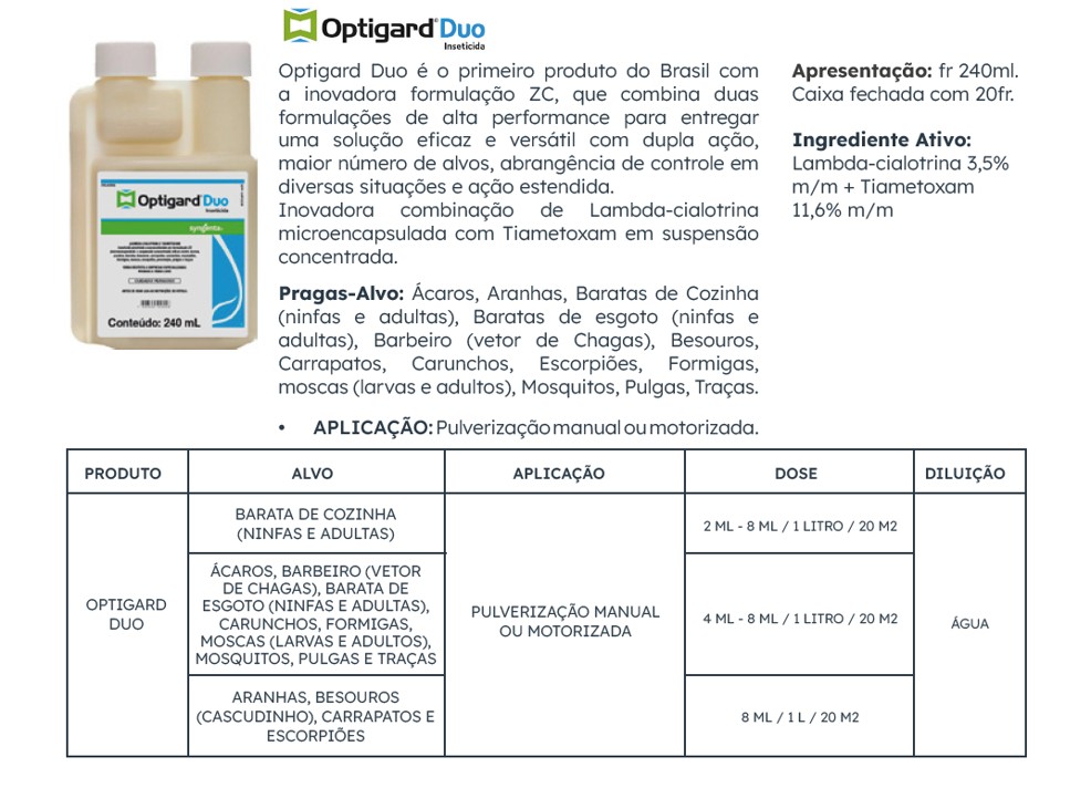 Optigard Duo é o primeiro produto do Brasil com a inovadora formulação ZC, que combina duas formulações de alta performance para entregar uma solução eficaz e versátil com dupla ação, maior número de alvos, abrangência de controle em diversas situações e ação estendida.